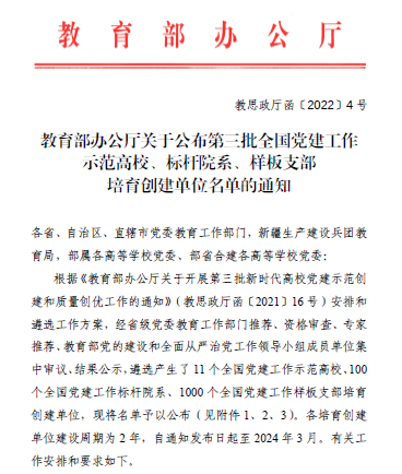 近日,教育部办公厅和天津市委教育工委市教委相继发布了《关于公布第三批全国党建工作示范高校、标杆院系、样板支部培育创建单位名单的通知》和《关于公布第二批新时代天津市高校党建“领航工程”创建培育单位名单的通知》,我校取得了优异成绩,5个建设单位进入创建培育序列,具体如下。